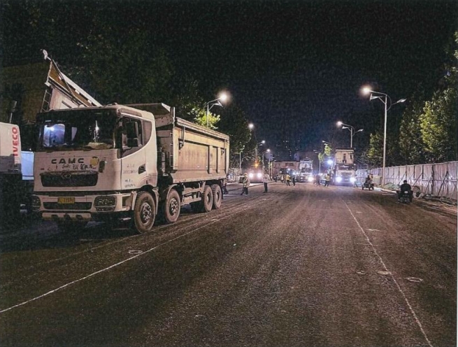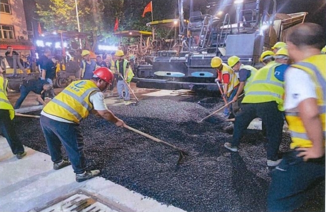 在施工現(xiàn)場,四臺攤鋪機梯隊作業(yè),十余臺碾壓設備作 業(yè)有序,各工作小組、各工種分工協(xié)作、同步進行。管理人 員嚴把現(xiàn)場工序管理,緊盯現(xiàn)場瀝青攤鋪質量、碾壓等關鍵 環(huán)節(jié);七十余名工人頂著近40℃的高溫環(huán)境作業(yè),有條不紊 地開展卸料、攤鋪、碾壓、收邊等一道道工序;在酷暑難耐 的夜晚,奮戰(zhàn)在路面攤鋪的施工一線。